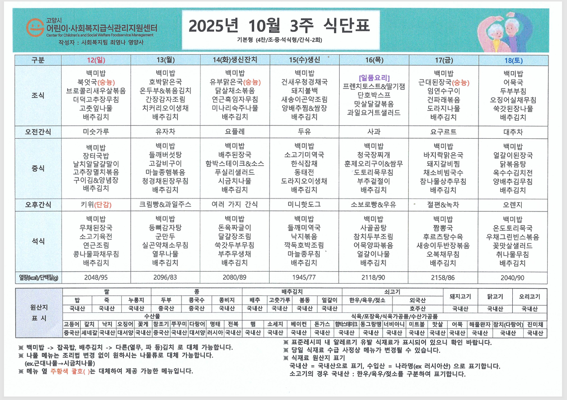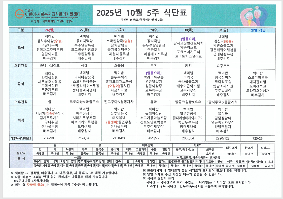 "높고 푸른 가을 하늘이 펼쳐지는 10월, 어르신들의 입맛과 건강을 생각한 식단을 준비했습니다. 따뜻한 한 끼로 행복을 더해드리겠습니다." ![]() ![]() ![]() ![]() ![]() |