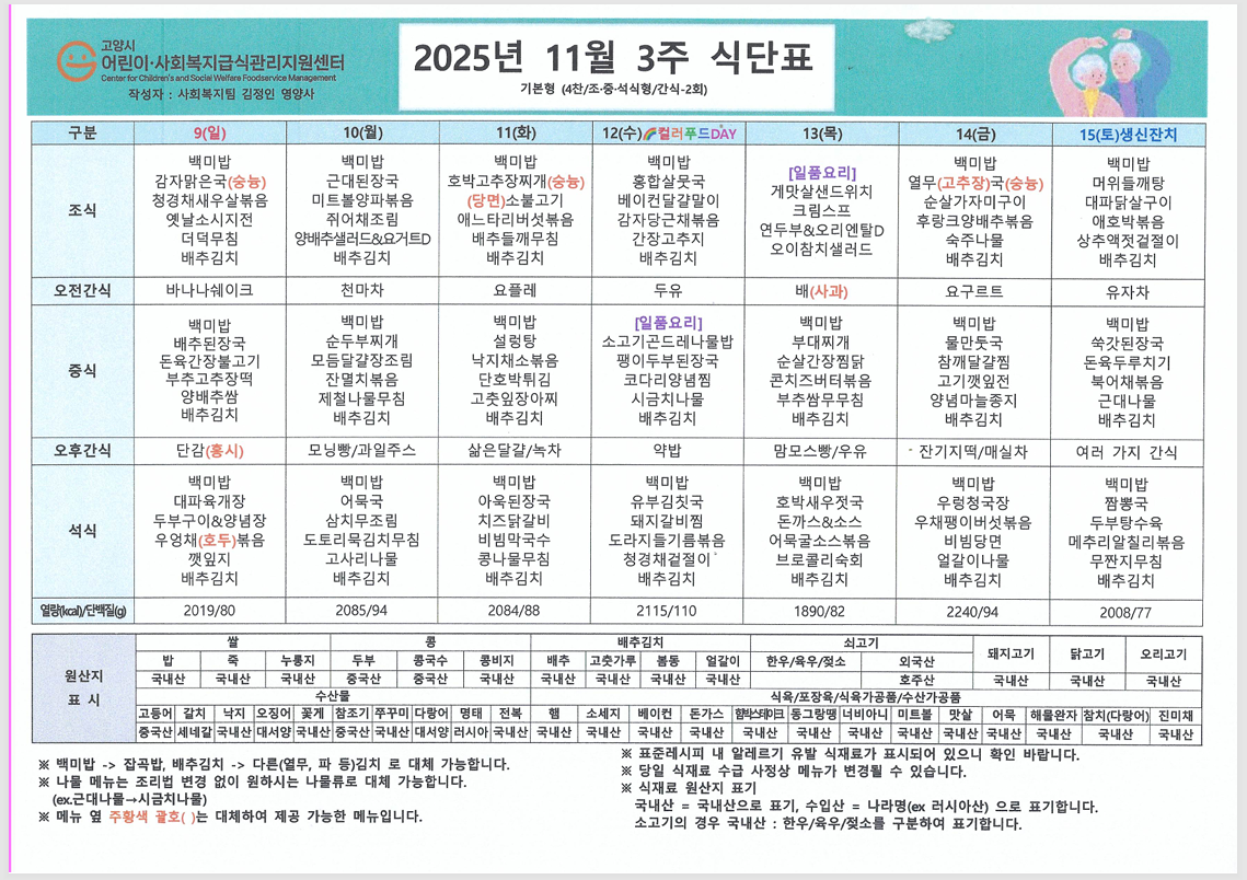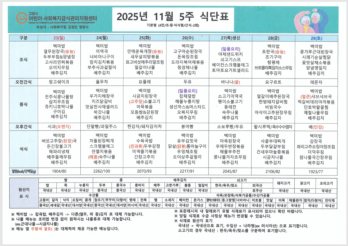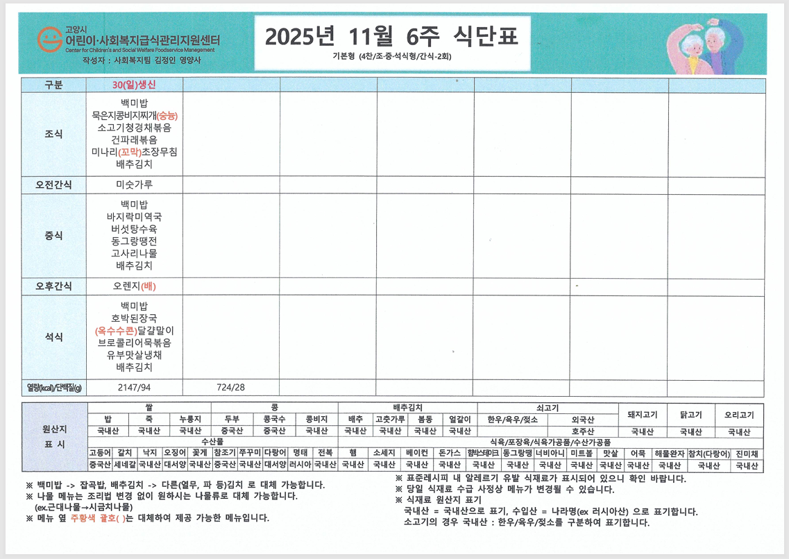 "가을이 깊어가고 아침저녁으로 찬 바람이 느껴지는 11월입니다. 어르신들께서 맛있게 드시고 힘내실 수 있도록 영양사 선생님이 정성껏 짜주신 11월 식단표 입니다!!" ![]() ![]() ![]() ![]() ![]() ![]() |