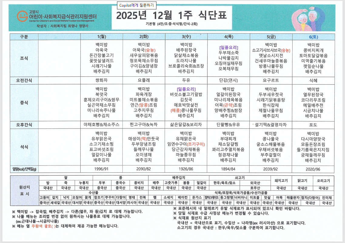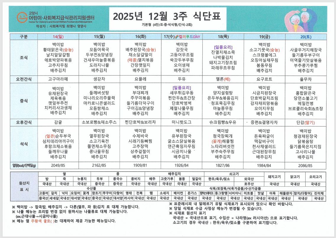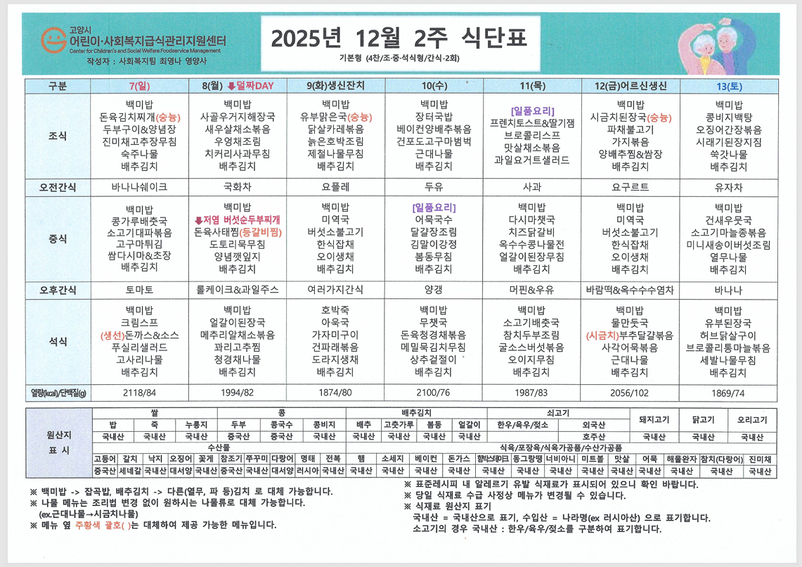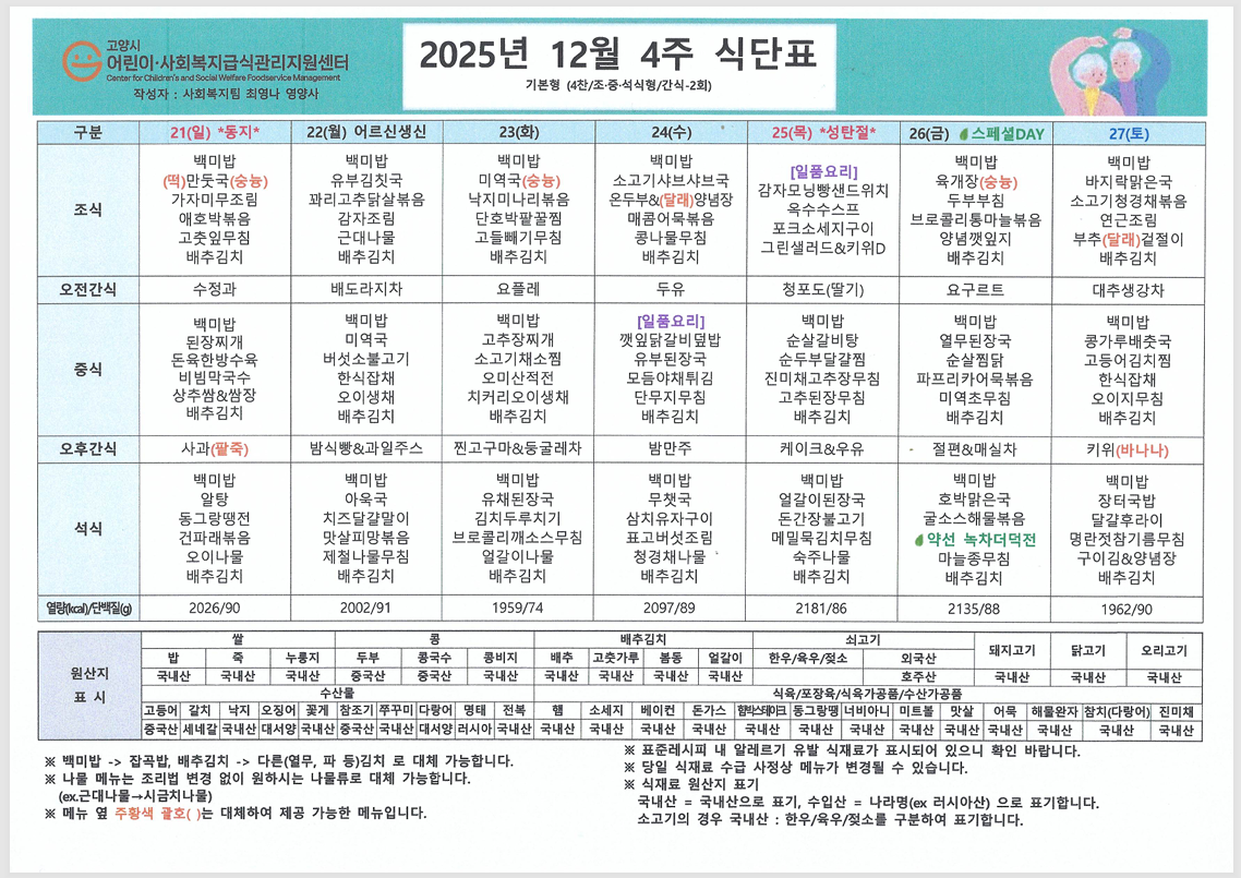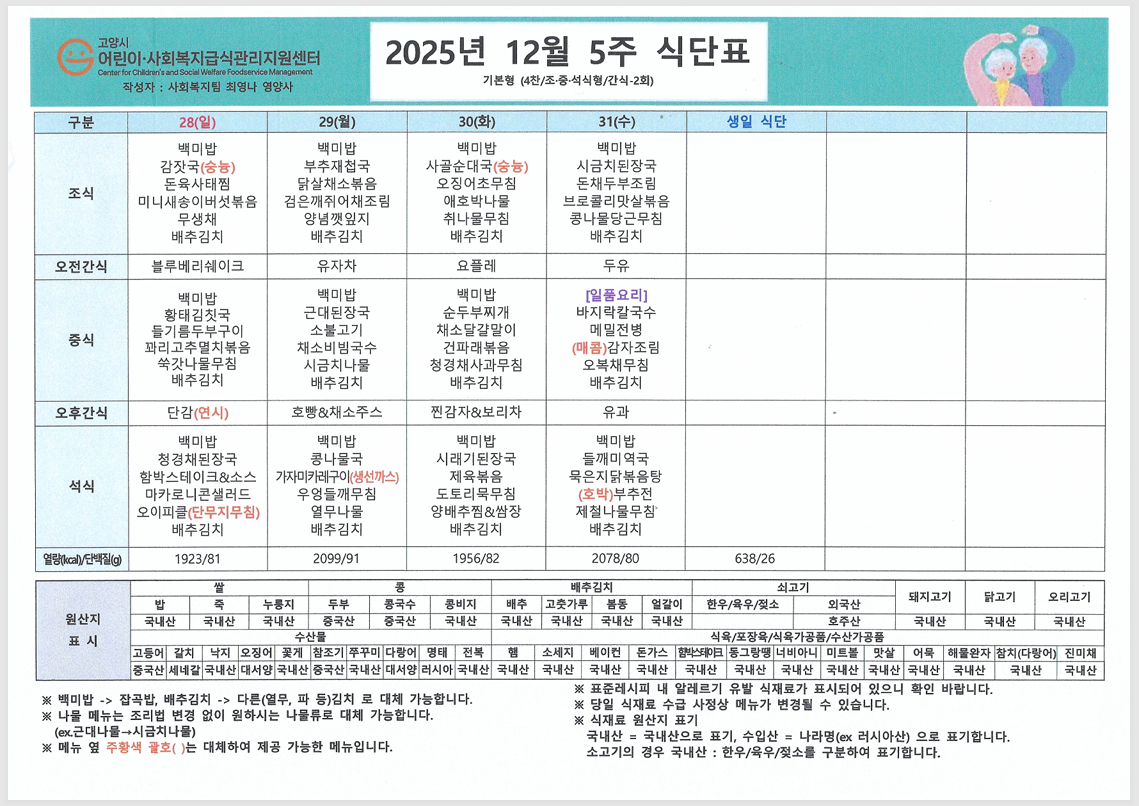 한 해의 끝자락인 12월, 차가운 바람 속에서도 따뜻함이 느껴지도록 영양 가득한 식단을 준비했습니다. 어르신들께서 맛있고 건강하게 식사하시길 바라며 12월 식단표를 안내드립니다. ![]() ![]() ![]() ![]() ![]() |