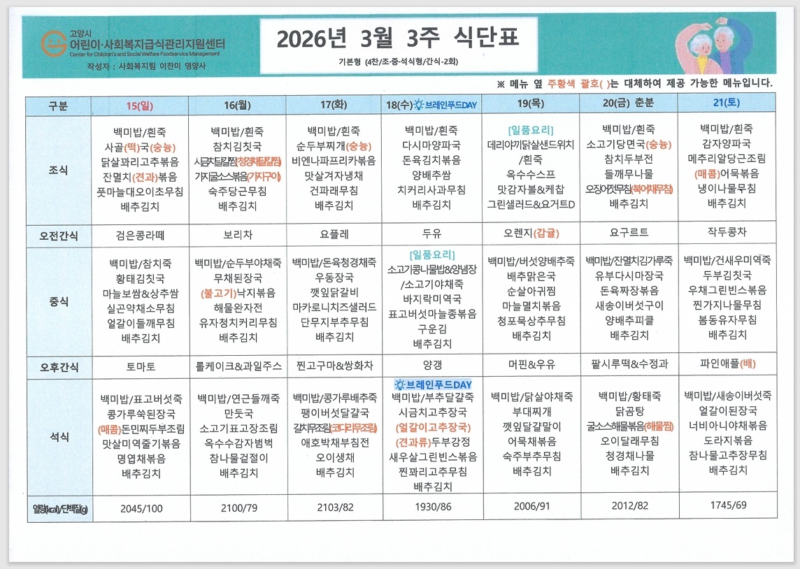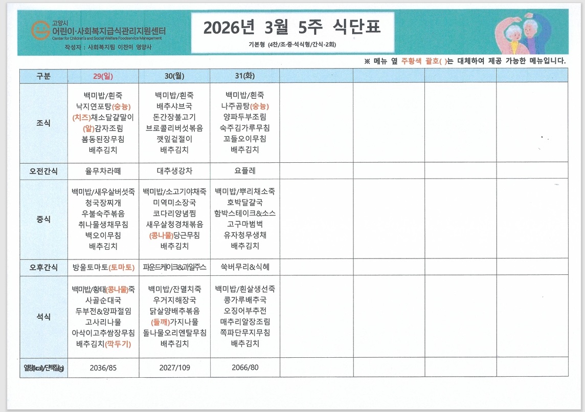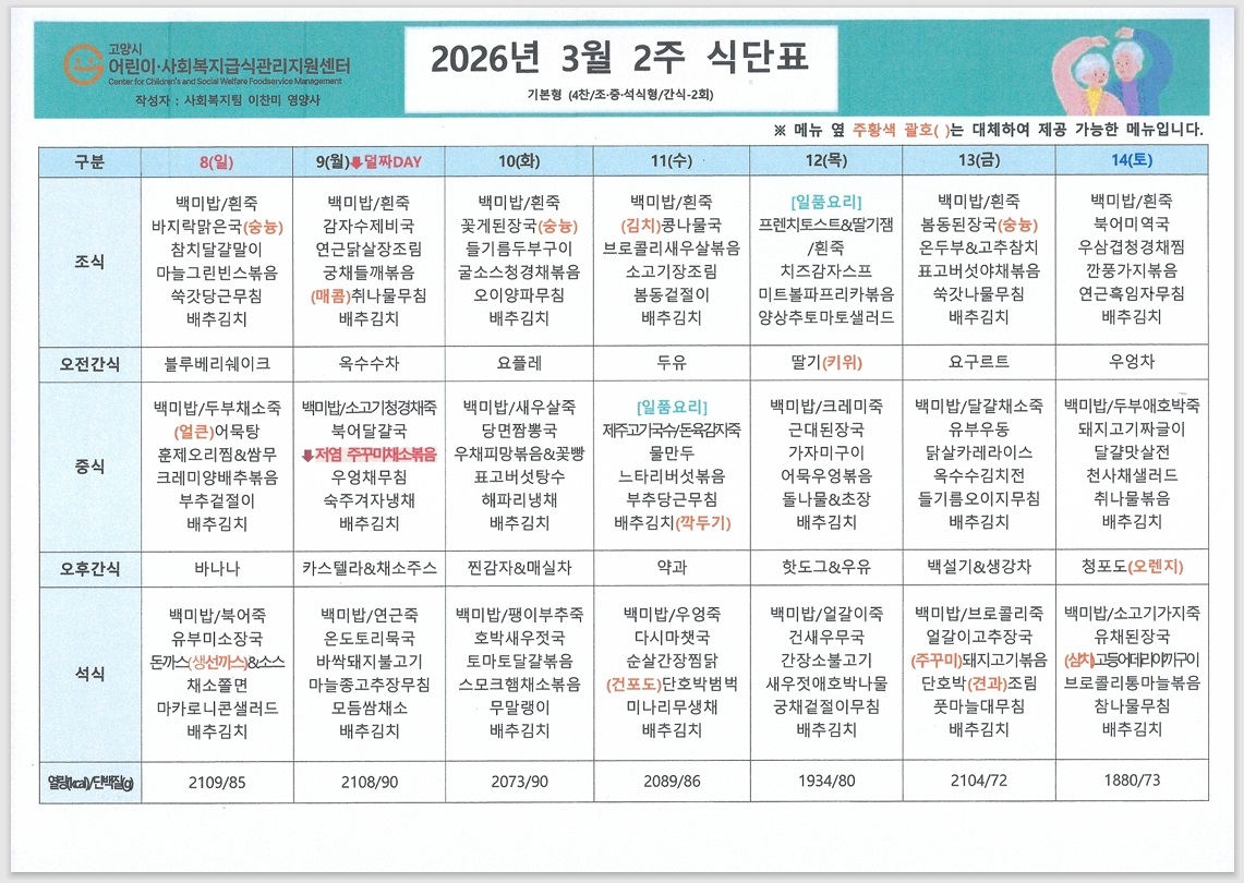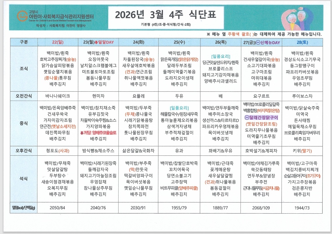 | 제목 | 2026년 3월 식단표 | 공지일 | 2026.02.26 |